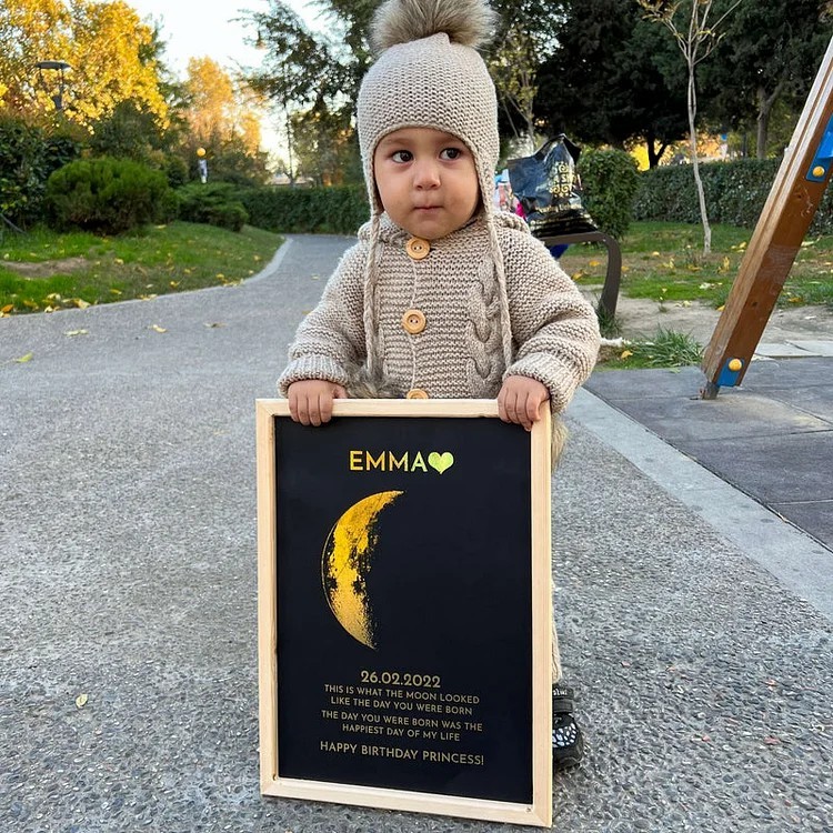 - Moon Illustration: The moon phase image is recreated based on the birth date of the individual, creating a beautiful and meaningful memento.