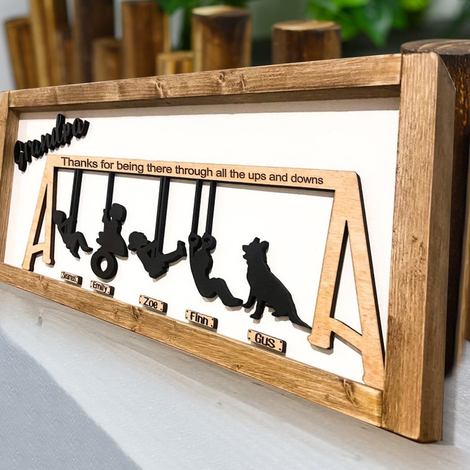 Engraved with the heartfelt message, 'Thanks for being there through all the ups and downs.', this piece is a touching tribute to the unwavering support of moms, dads, grandmothers, and grandfathers.